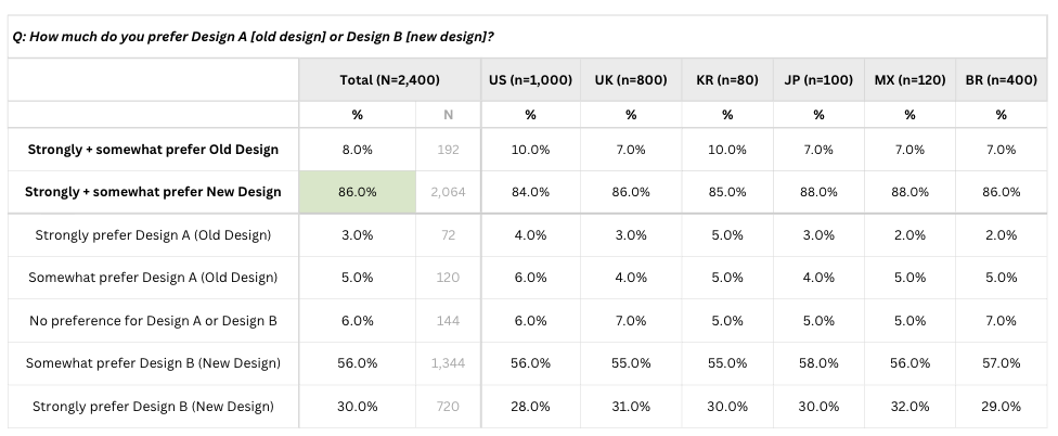 Survey results showed that most creators (86%* top2) preferred the new CRP designs compared to the old designs (8%*).