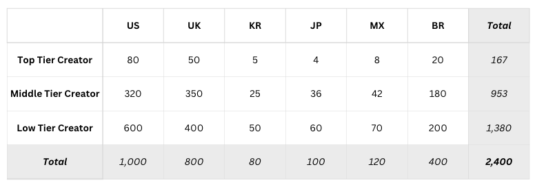 Analysis: After I aligned with the product team on the total sample size as well as a regional breakdown, I downloaded the data set and analyzed the data via R. One limitation of the internal tool was that it did not allow us to distinguish responses from top-tier, mid-tier, and lower-tier creators.